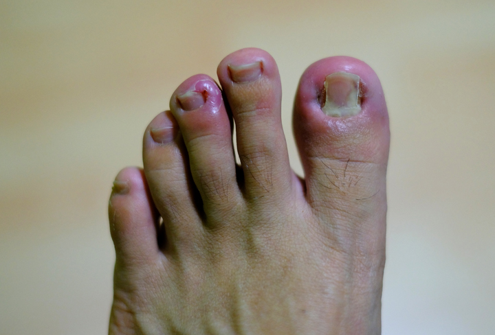 An ingrown toenail occurs when a section of the nail penetrates the skin. It usually occurs in the 1st toe, but the smaller toes can also be affected. Typically the toe becomes swollen and inflamed around the nail. It may vary in severity from slight discomfort to acute pain, often discharging fluid.